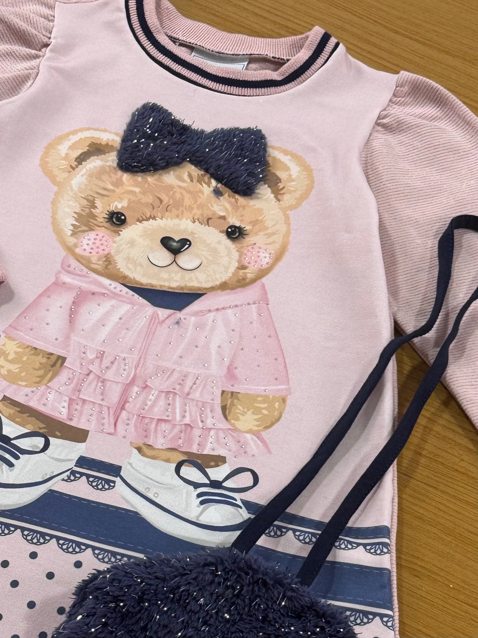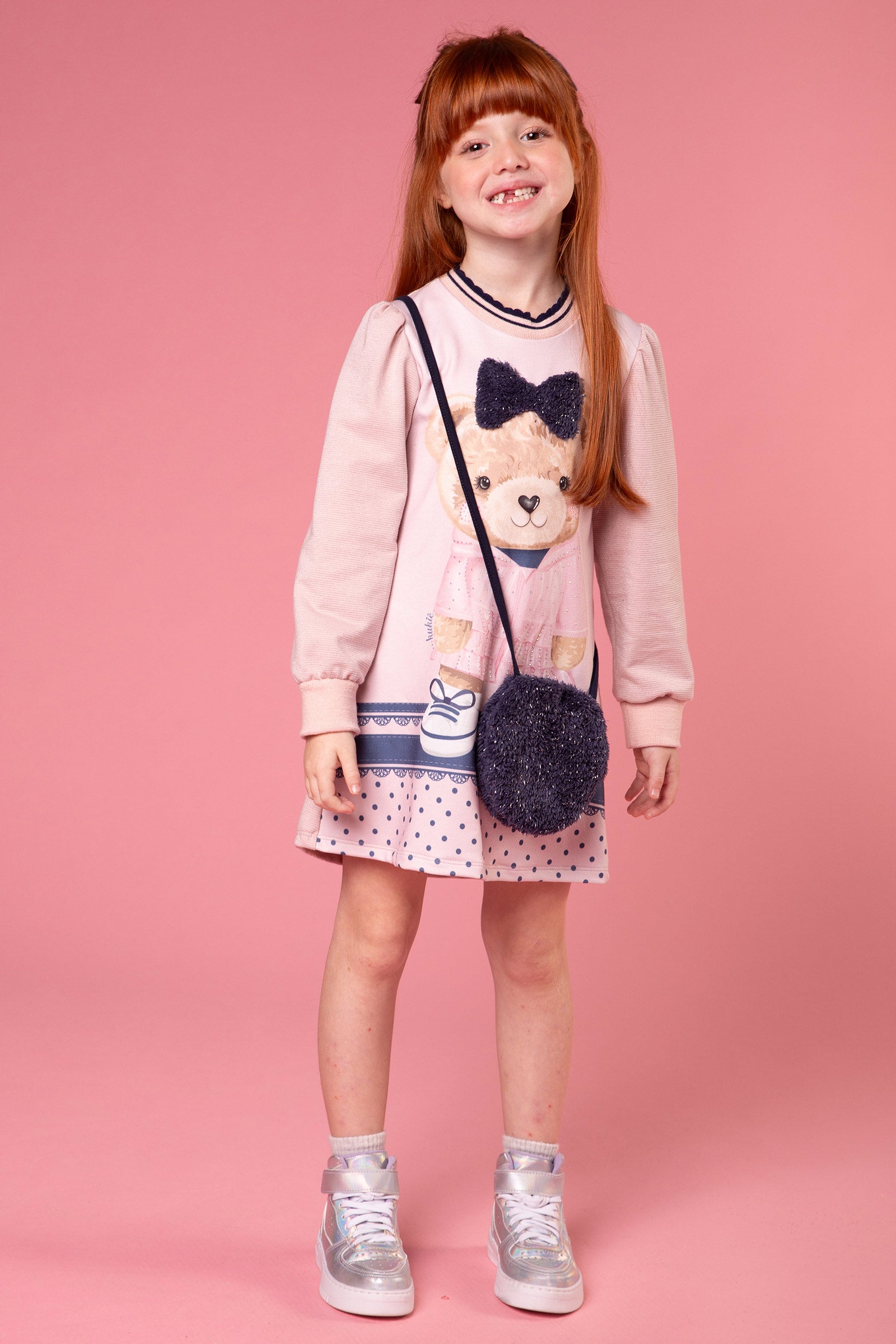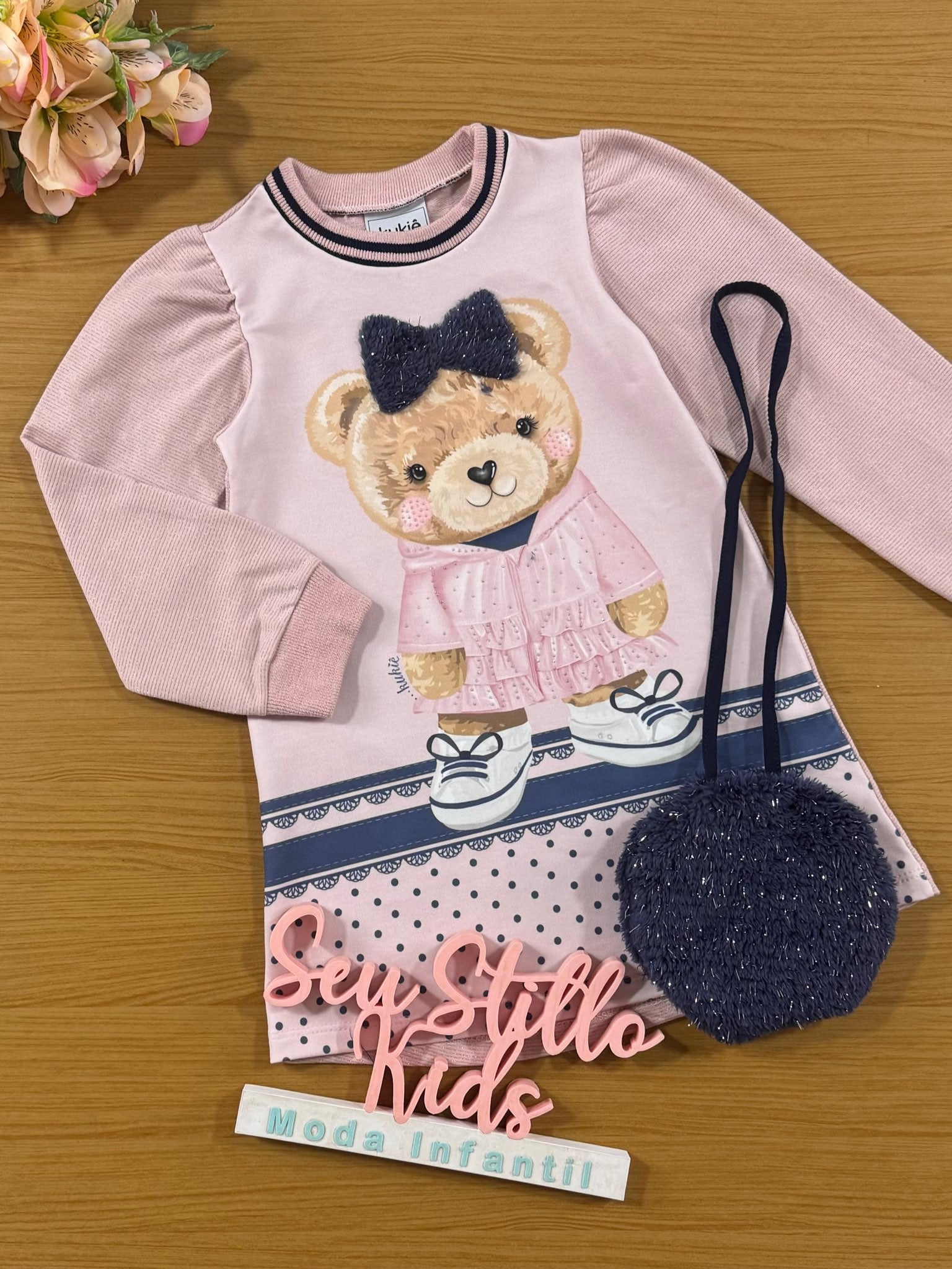 Vestido Infantil Kukie Inverno Ursinha Rosa Com Bolsinha