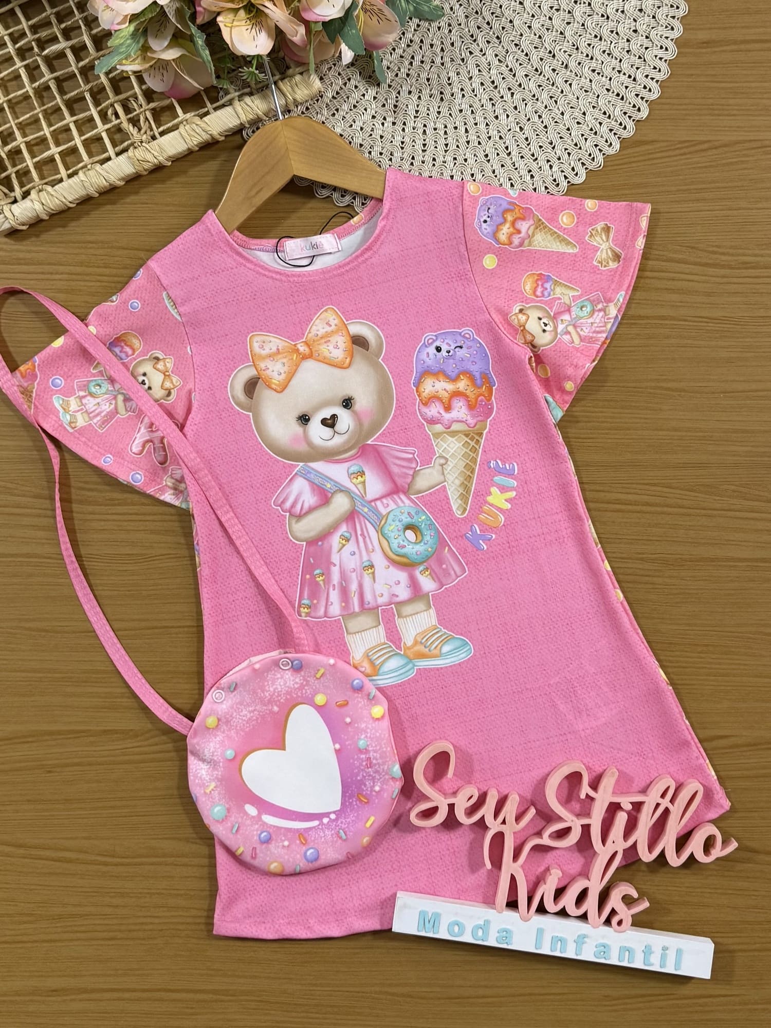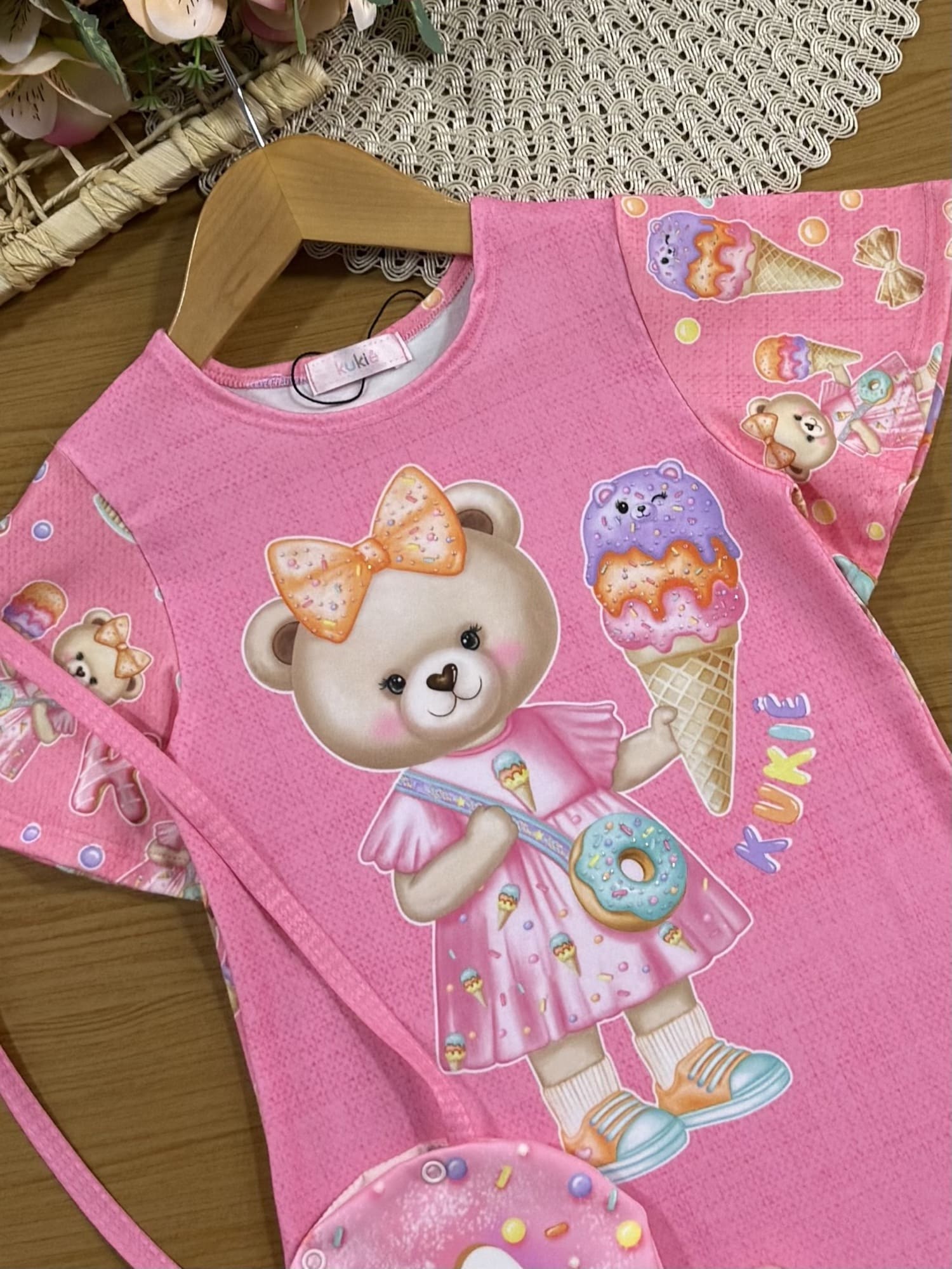 Vestido Infantil Kukiê Rosa Ursinha com Bolsinha