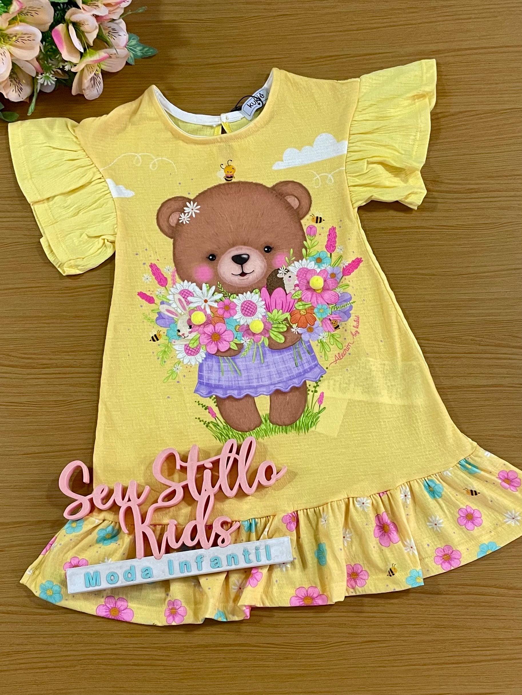 Vestido Infantil Kukie Verão Amarelo Ursinha Flores