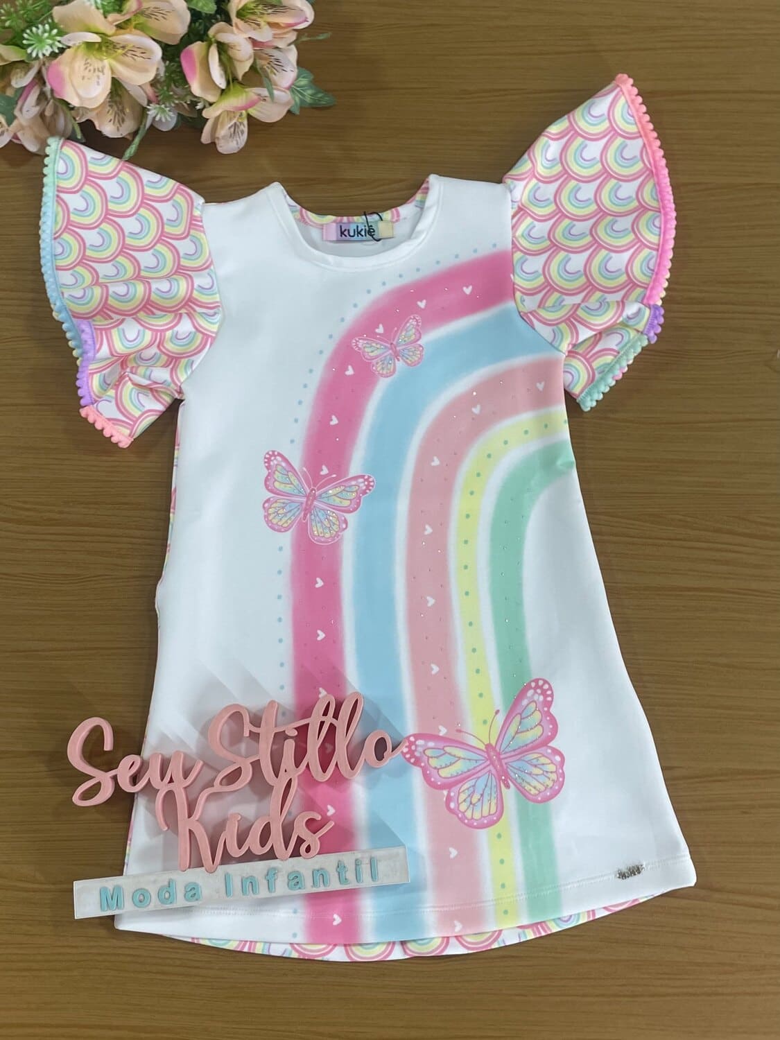Vestido Infantil Kukie Verão Branco Borboletas Arco-íris