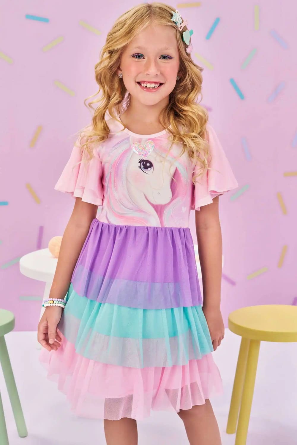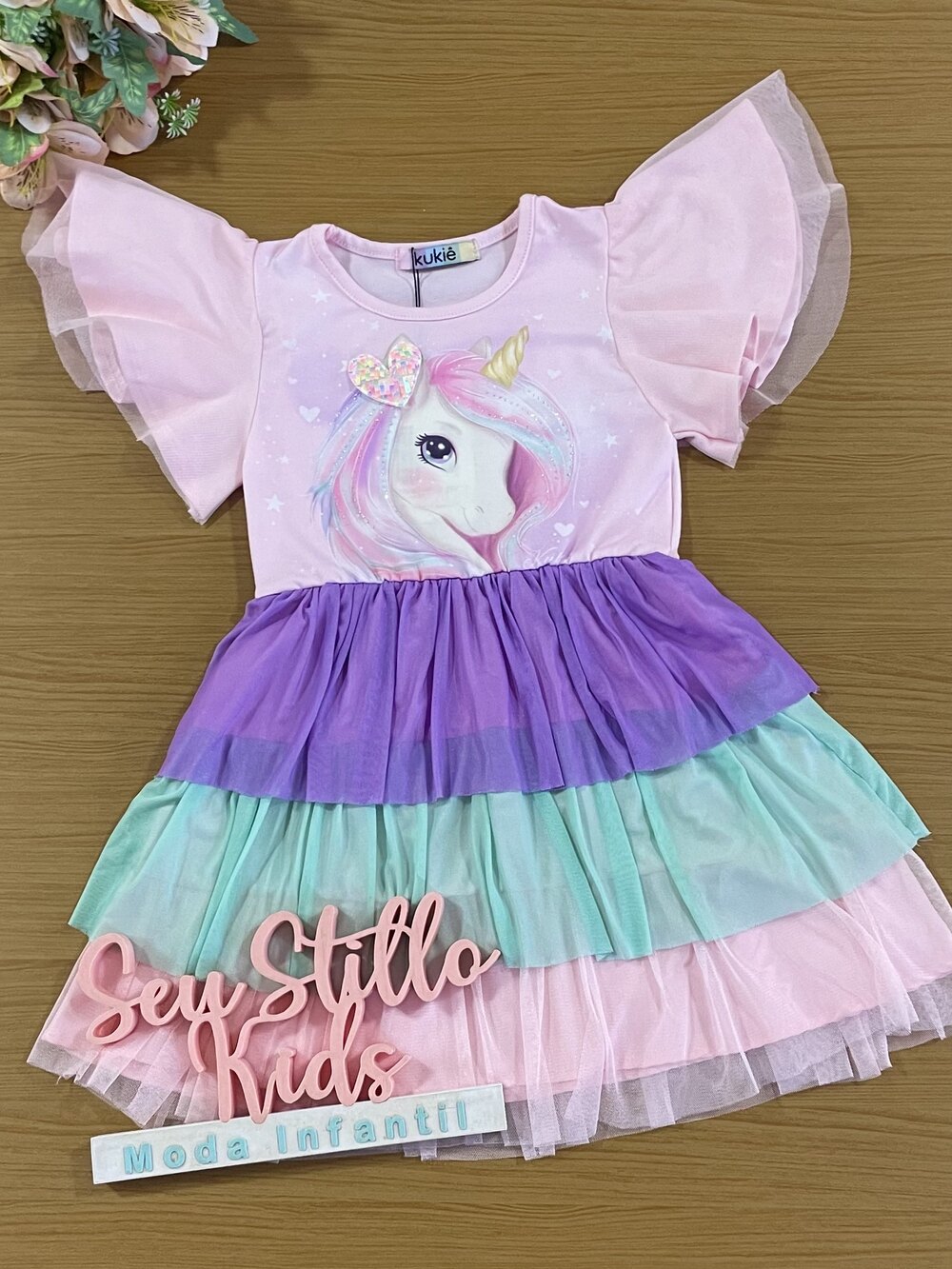 Vestido Infantil Kukie Verão Colorido Tule Unicórnio