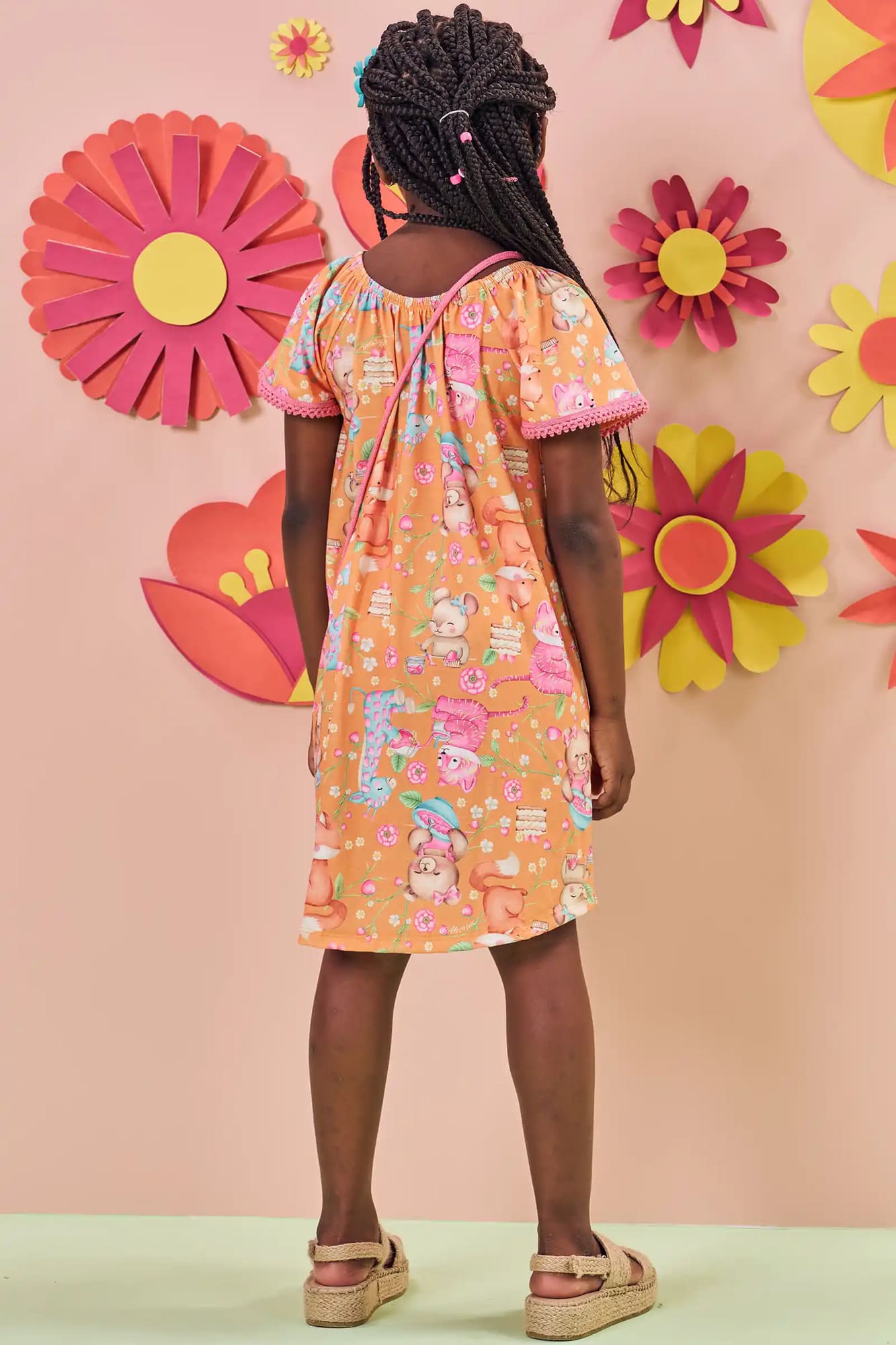 Vestido Infantil Kukiê Verão Laranja Festa dos Animais com Bolsinha