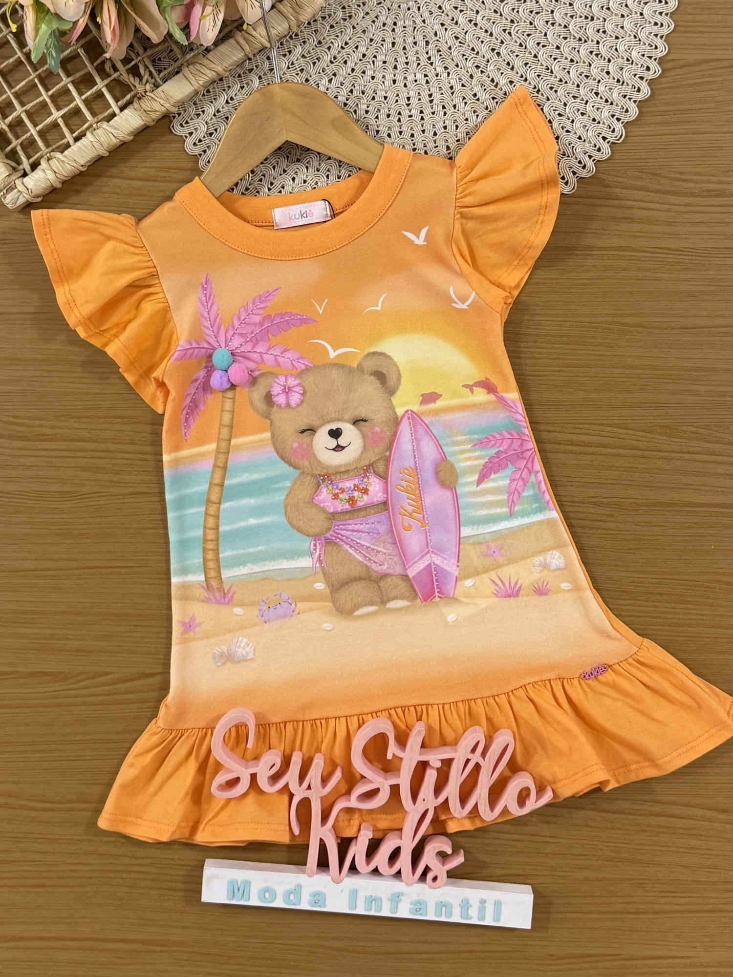 Vestido Infantil Kukiê Verão Laranja Ursinha na Praia