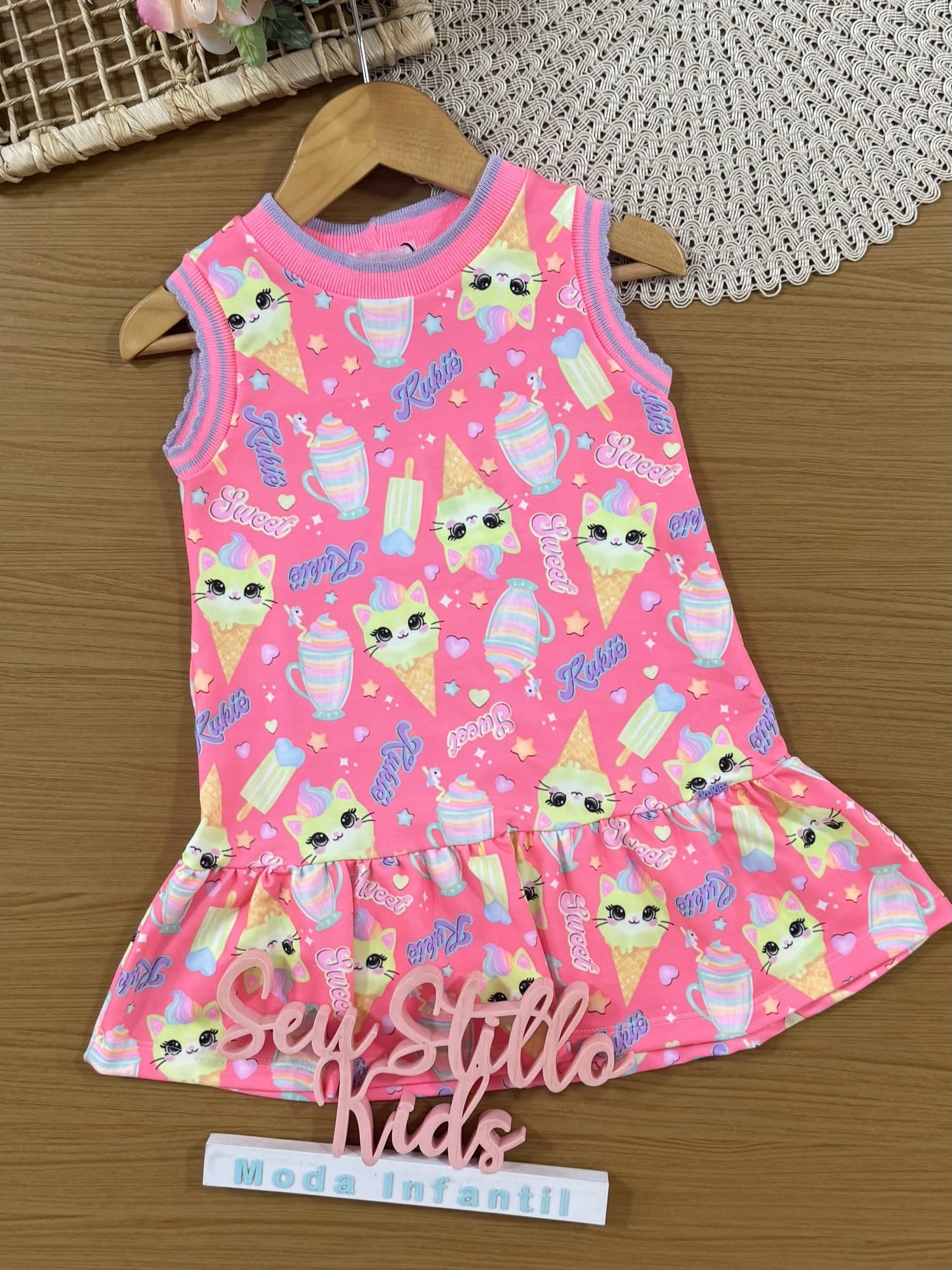 Vestido Infantil Kukiê Verão Rosa Gatinha Sorvete