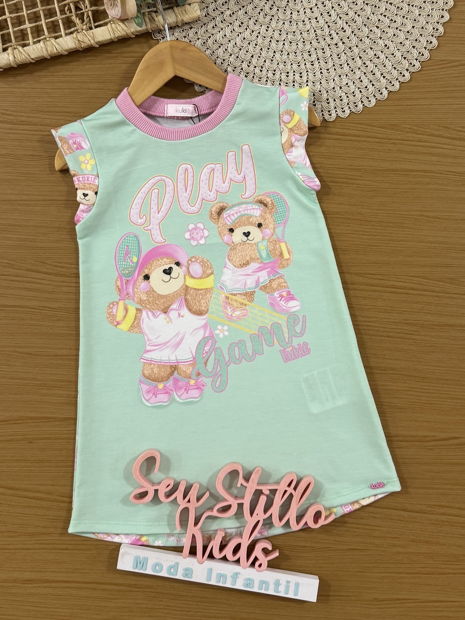 Vestido Infantil Kukiê Verão Verde Ursinhas Tênista
