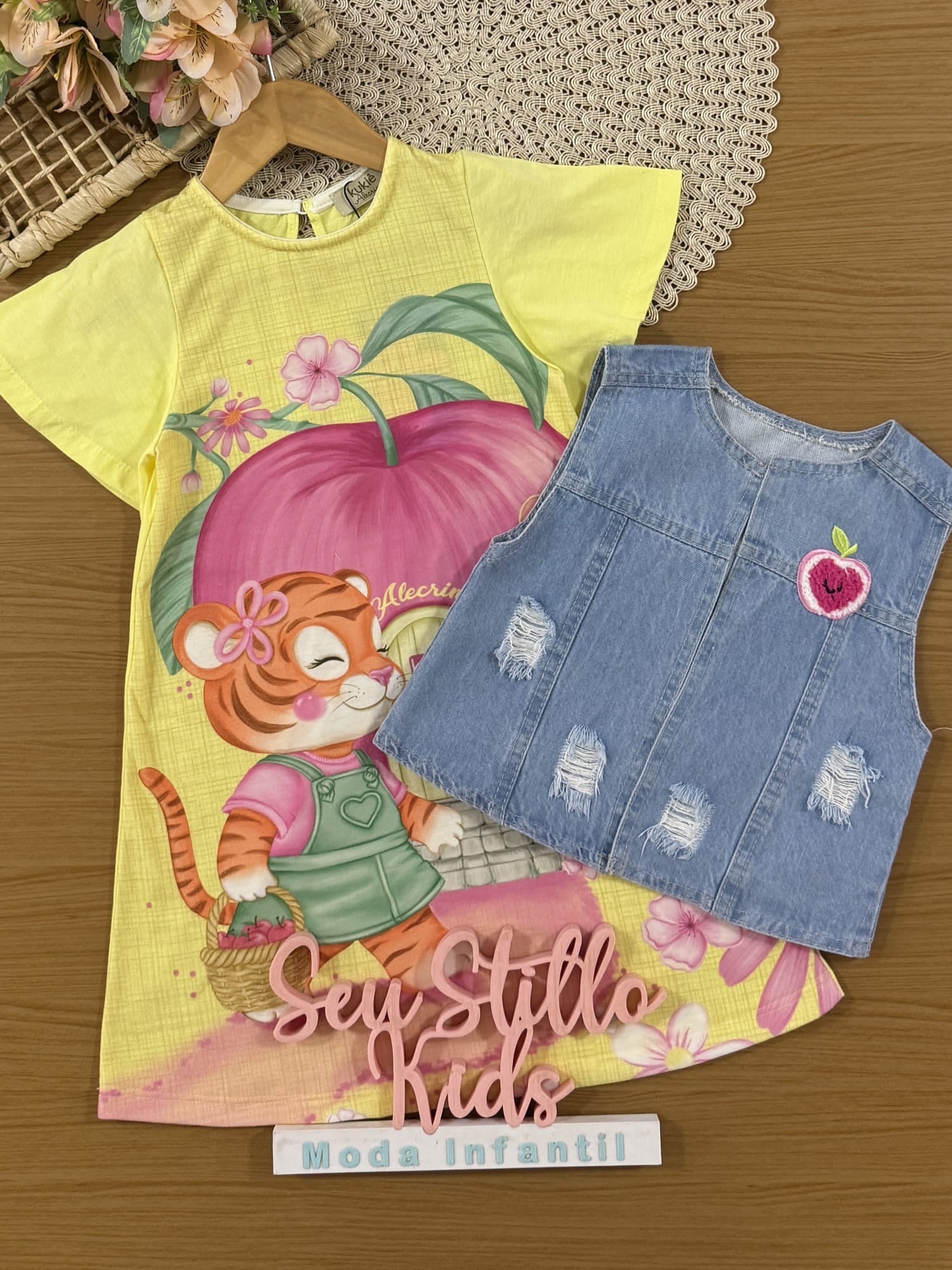 Vestido Infantil Kukiê Verão Vestido Amarelo Casinha de Maça com Colete jeans