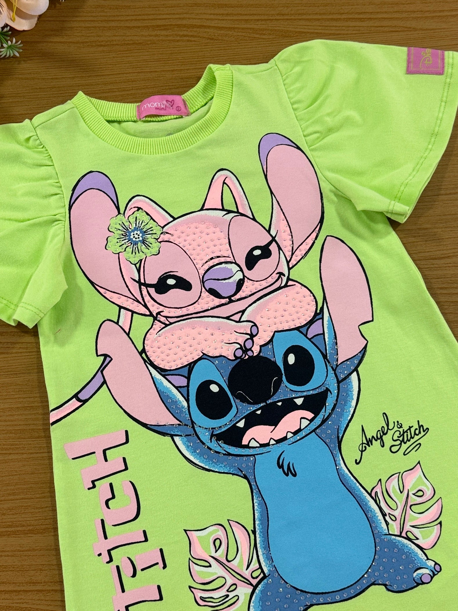 Vestido Infantil Momi Verão Verde Stitch e Angel